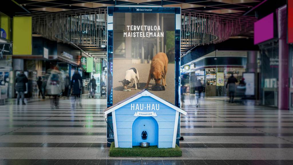This advertisement consists of a cartoon-looking doghouse with a food bowl inside the opening of the doghouse, with a patch of grass underneath. This advertisement uses the power of artificial intelligence and facial recognition to detect when a dog is nearby. When a dog is near, the doghouse distributes Hau-Hau Champion dog food for the dog to enjoy. If the dog likes the food, owners can buy it by using the QR code displayed on the digital billboard behind the doghouse. Another important feature of this dog food vending machine is that it also uses UV disinfection to ensure the dogs will be safe eating from this bowl.
